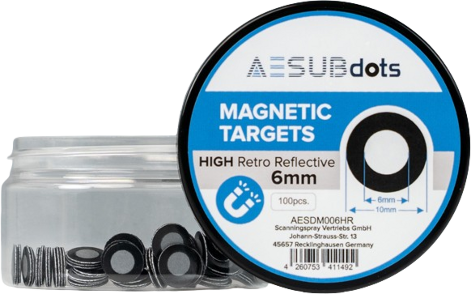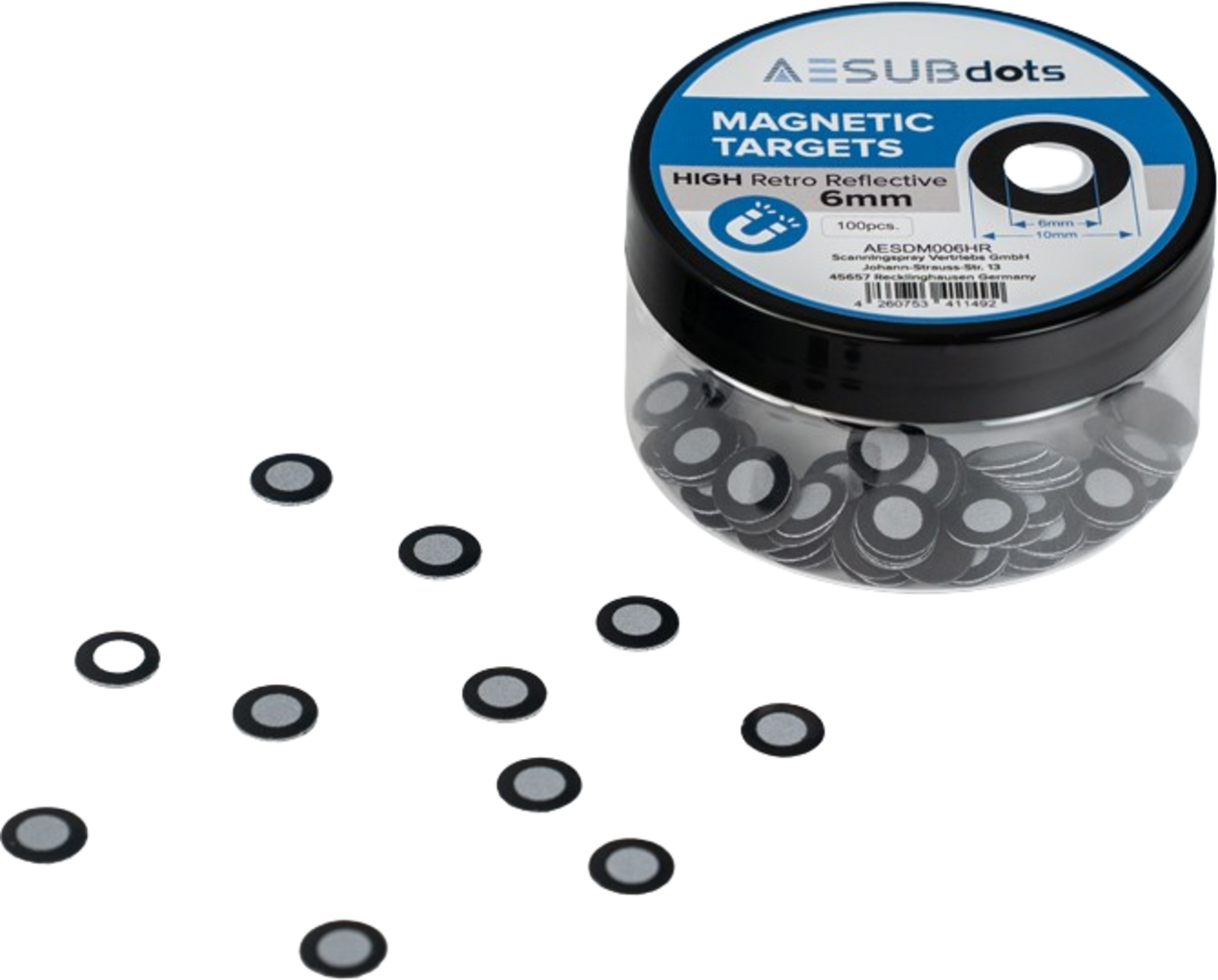 AESUBdots high retro reflective magnetische referentiepunten zijn speciaal ontwikkelde markers voor professionele 3D-scantoepassingen die de precisie en efficiëntie van 3D-scanworkflows aanzienlijk verhogen. Dankzij hun sterk retroreflecterende oppervlak wordt het licht dat door de scanner wordt uitgezonden, teruggeleid naar de bron. Hierdoor herkent de scanner op betrouwbare wijze de referentiepunten, zelfs op complexe geometrieën, donkere oppervlakken of bij grote scanvolumes.