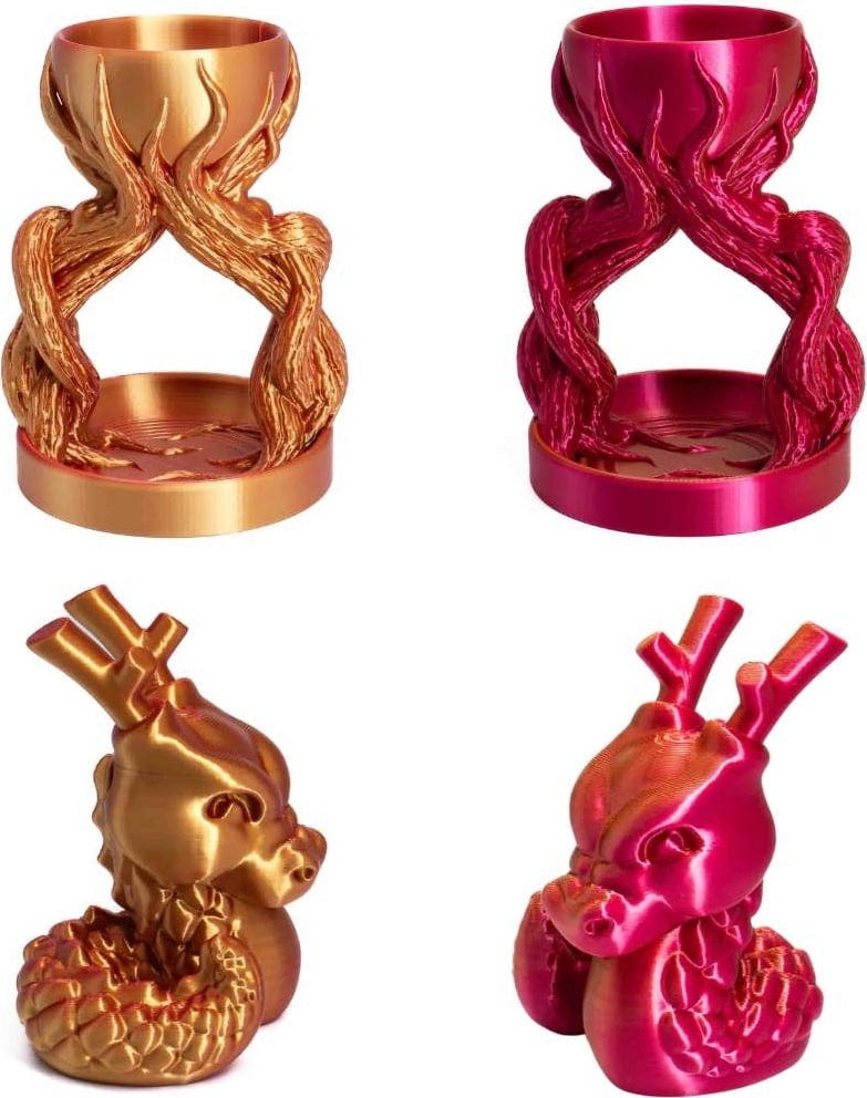 Dankzij de ultramoderne co-extrusietechnologie combineert PLA Silk Multicolor twee of zelfs drie kleuren in slechts één filamentstreng. Dit zorgt voor vloeiende kleurovergangen en unieke glanseffecten die veranderen afhankelijk van de kijkhoek. Dit maakt elke print uniek, of het nu vazen, beeldjes, sieraden of decoratieve woonaccessoires zijn.