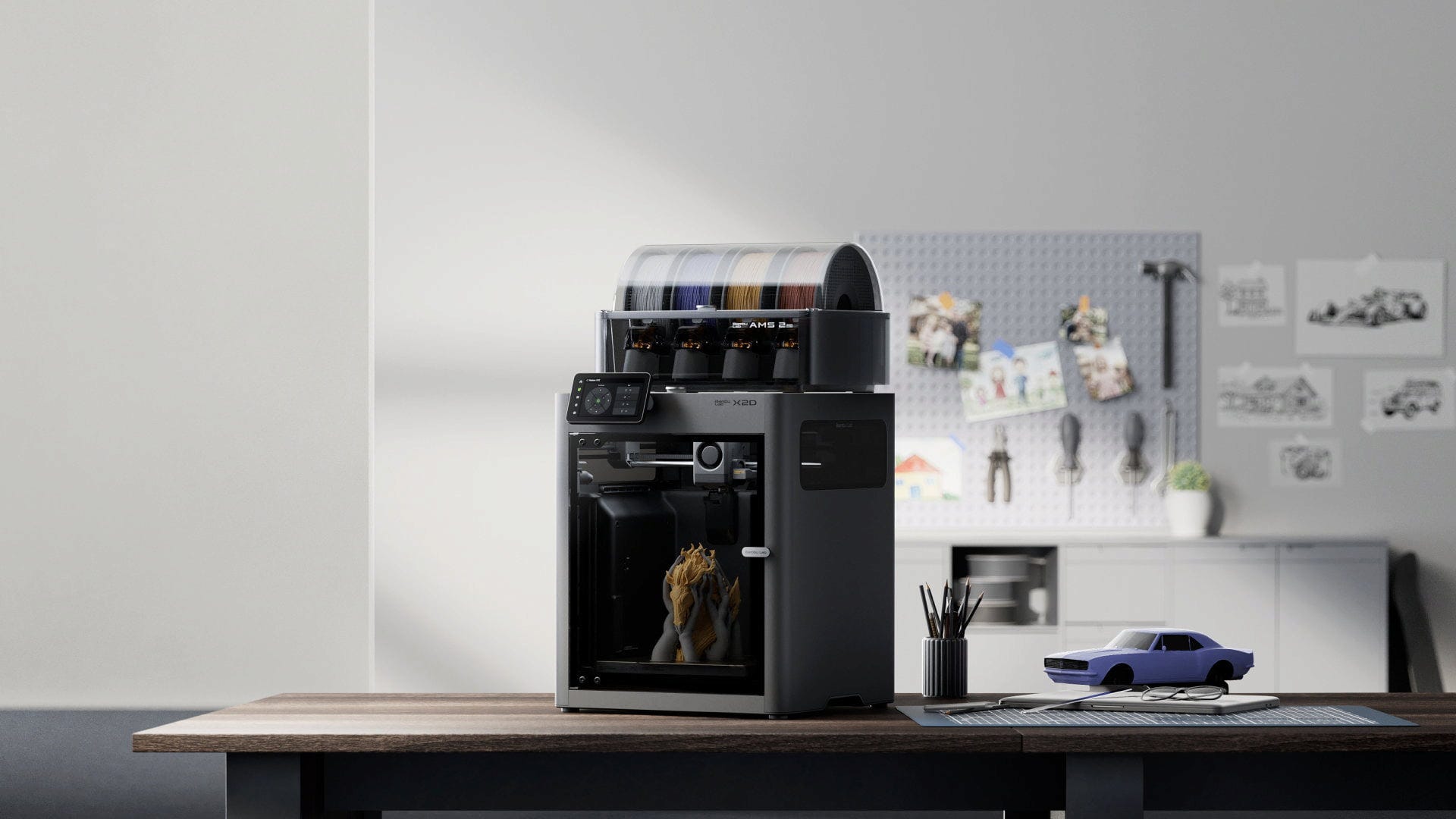 De Bambu Lab X2D 3D-printer is de volgende evolutiestap in de Bambu Lab X-serie en is specifiek ontwikkeld voor nauwkeurig multi-material 3D-printen met supportstructuren. Met zijn dual-extruder systeem, gesloten verwarmde printkamer en intelligente sensoren richt de X2D zich op iedereen die hoogwaardige functionele onderdelen, complexe geometrieën en schone support-interfaces wil realiseren. In combinatie met de AMS 2 Pro maakt de X2D bovendien geautomatiseerd multi-material en multicolor 3D-printen mogelijk, inclusief intelligente filamentwissels en geïntegreerde droging.