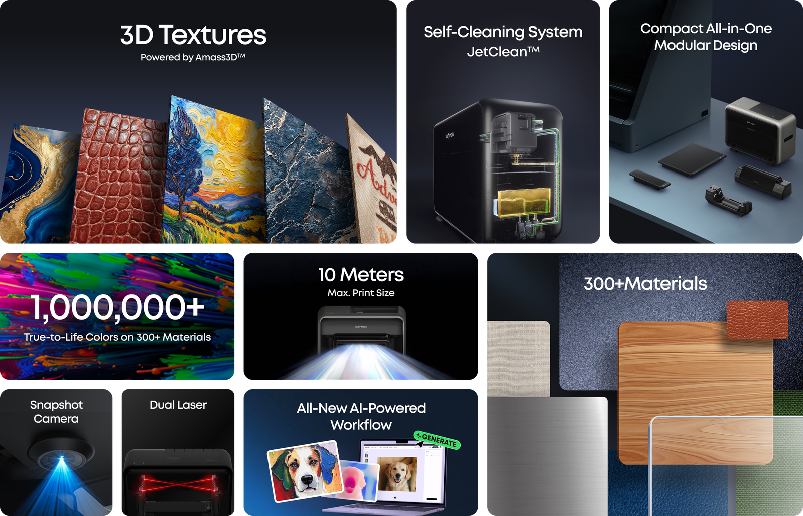 De Amass3D™-technologie maakt realistische oppervlaktestructuren met voelbare diepte (tot 5 mm hoog) mogelijk. Of het nu gaat om penseelstreken, een lederlook of natuurlijke structuren: elk detail wordt tastbaar. Zelfs de fijnste texturen zoals schubben, veren of reliëfs zien er zo realistisch uit dat ze zowel visueel als haptisch overtuigen.