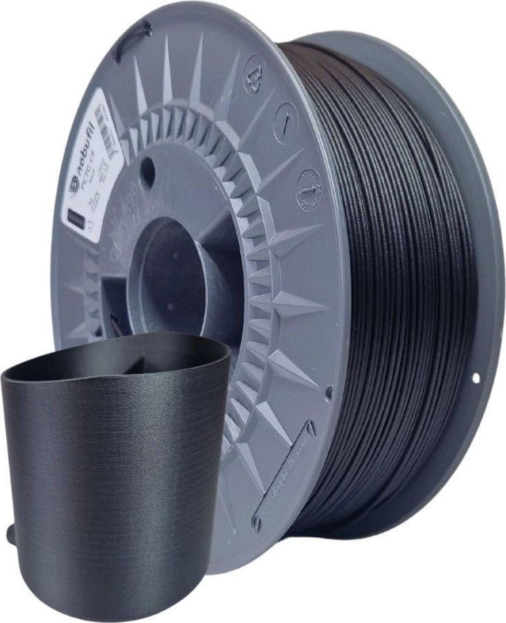 Het PCTG CF van Nobufil is een materiaal gemaakt van 10% gerecyclede koolstofvezels met verbeterde stijfheid en sterkte tijdens het printen. Het hoogwaardige filament heeft een verhoogde hittebestendigheid en geeft een elegante, matte finish die lelijke printlagen aan het oog van nieuwsgierige toeschouwers onttrekt en het geprinte object er professioneler laat uitzien.