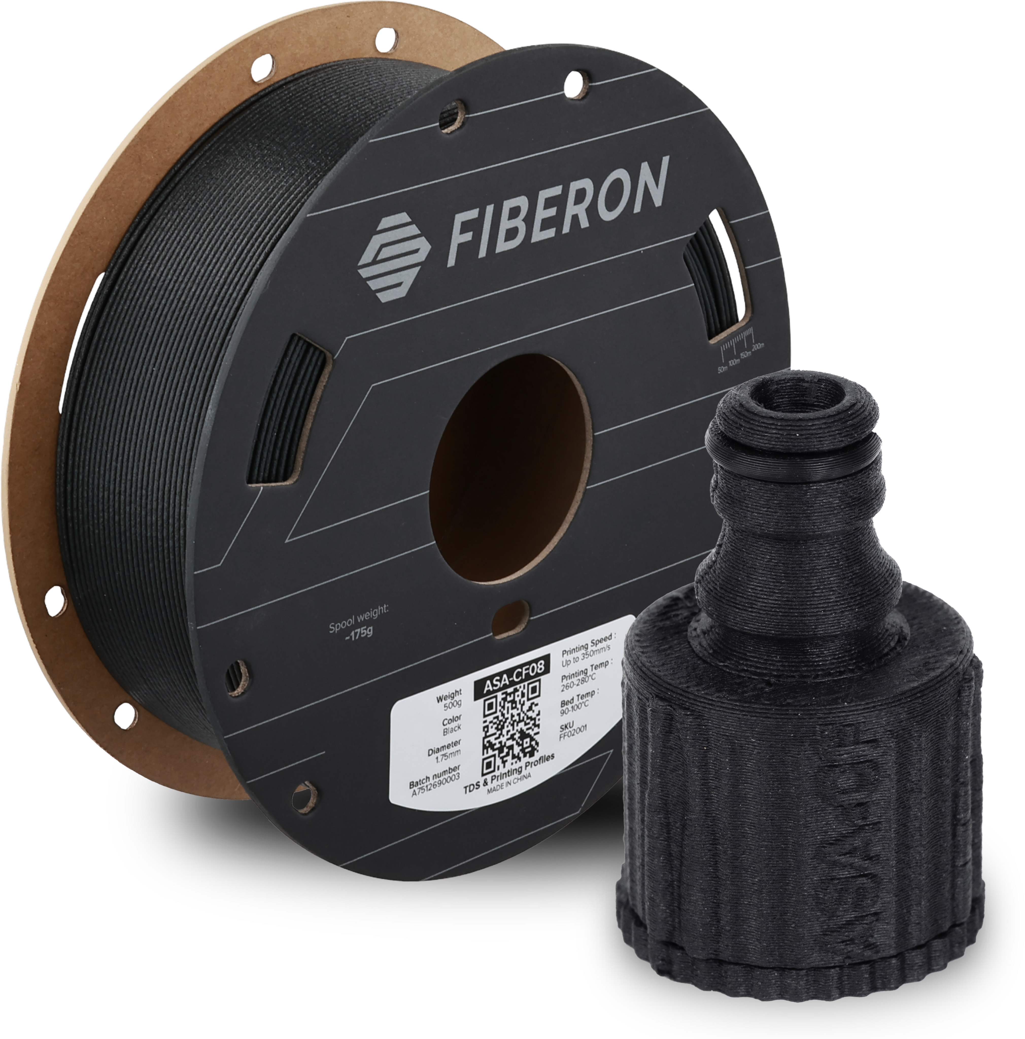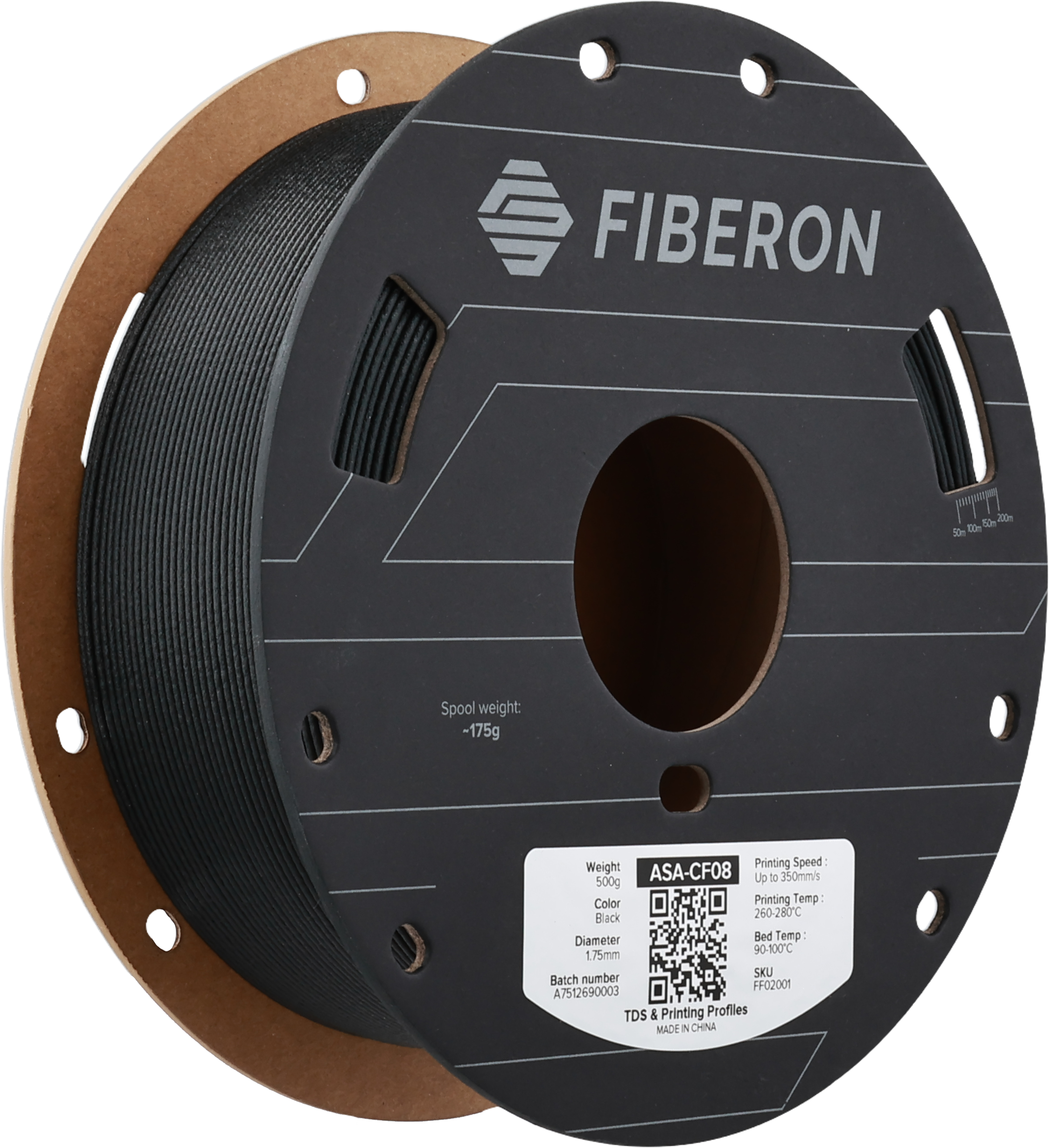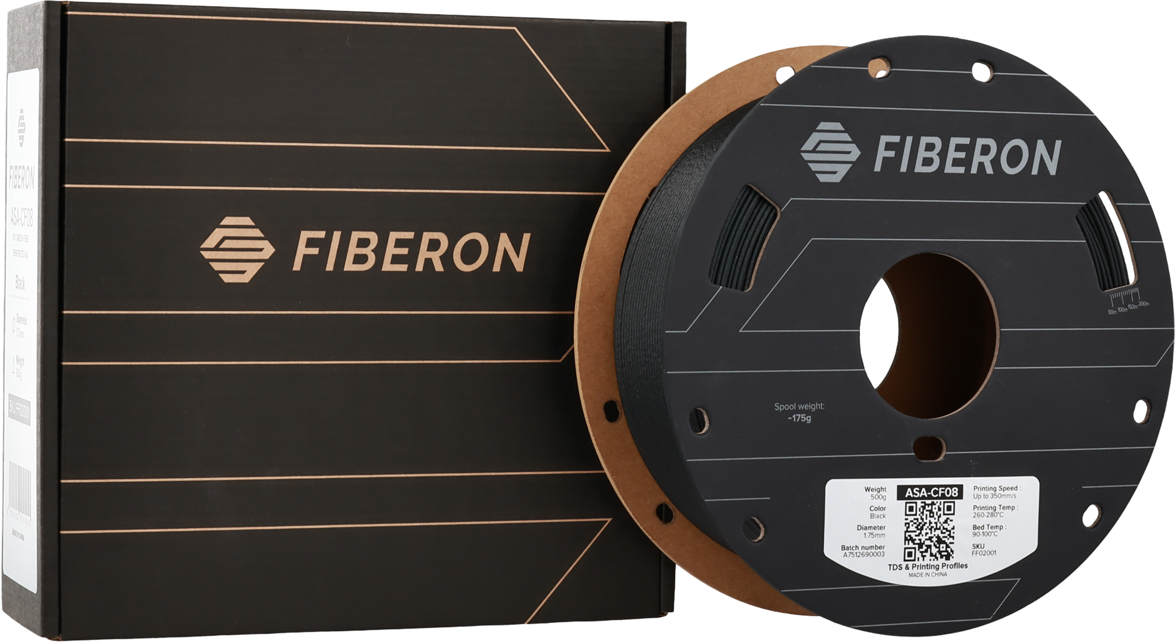 Fiberon™ ASA-CF08 is een hoogwaardig filament op basis van acrylonitril-styreenacrylaat (ASA) versterkt met 8% koolstofvezels. Het resultaat is een materiaal met uitzonderlijke stijfheid, hoge dimensionale stabiliteit en een mat, licht oppervlak, dat wordt gekenmerkt door zowel zijn mechanische eigenschappen als zijn esthetische kwaliteit.