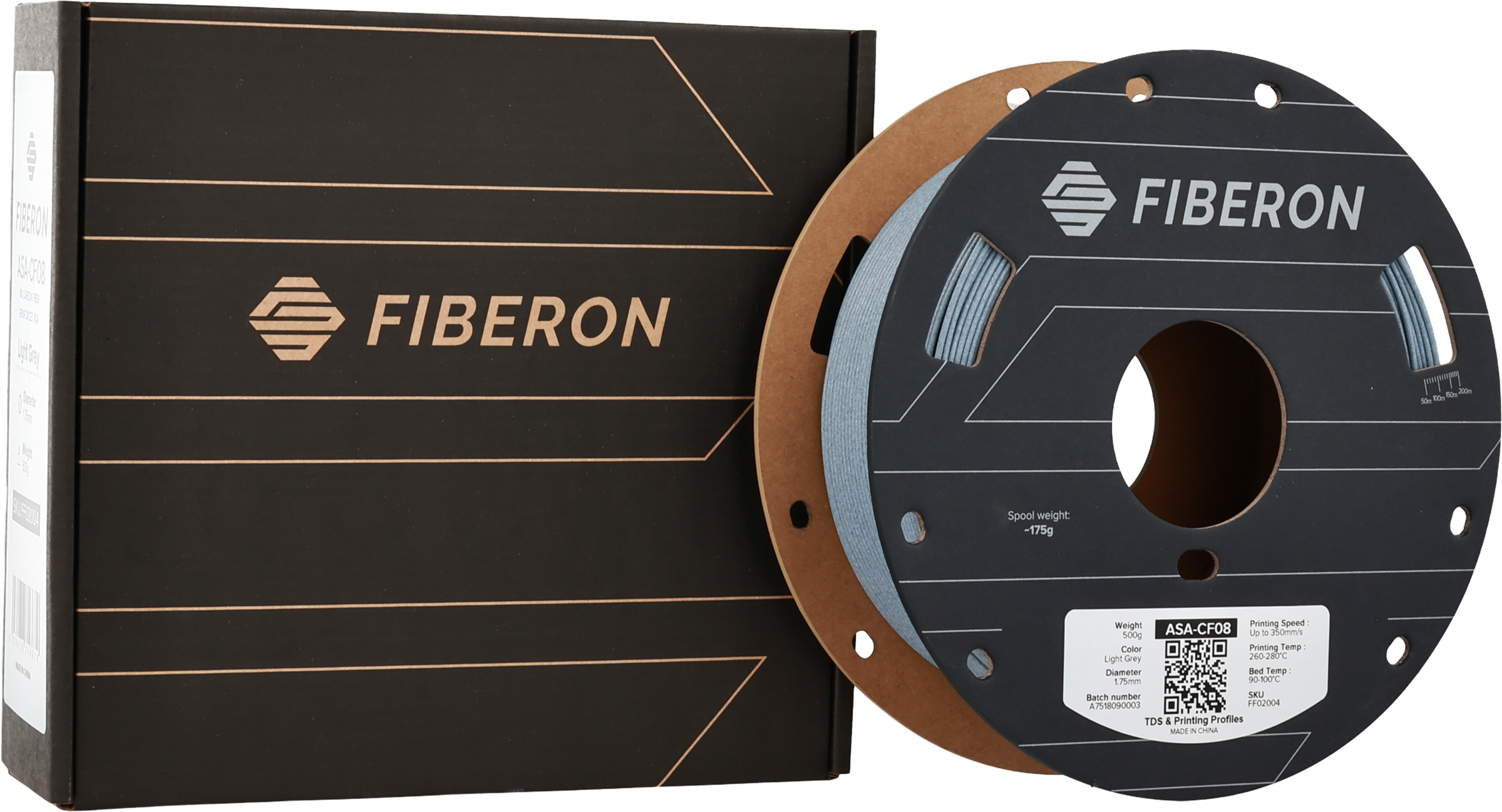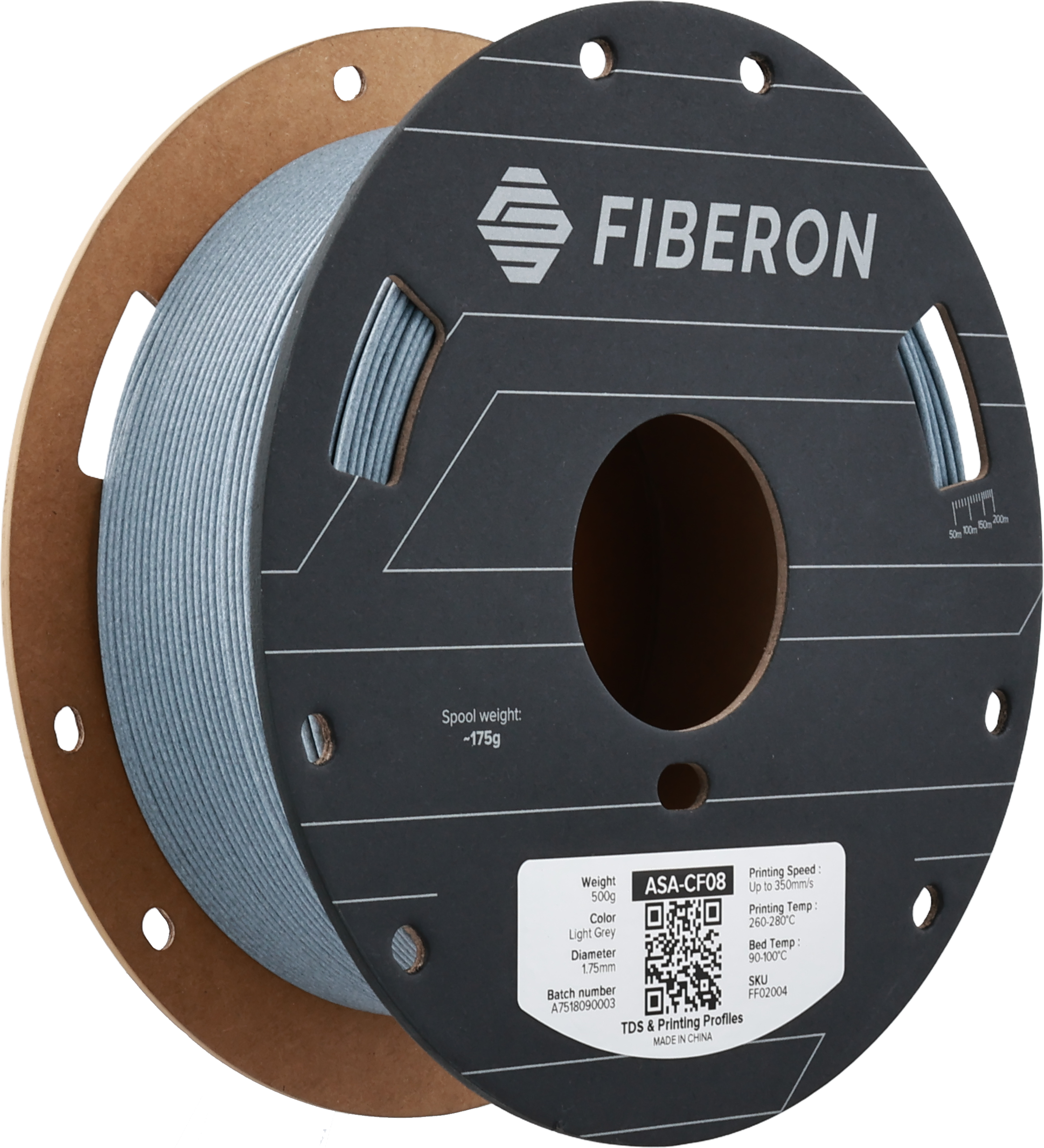 Fiberon™ ASA-CF08 is een hoogwaardig filament op basis van acrylonitril-styreenacrylaat (ASA) versterkt met 8% koolstofvezels. Het resultaat is een materiaal met uitzonderlijke stijfheid, hoge dimensionale stabiliteit en een mat, licht oppervlak, dat wordt gekenmerkt door zowel zijn mechanische eigenschappen als zijn esthetische kwaliteit.