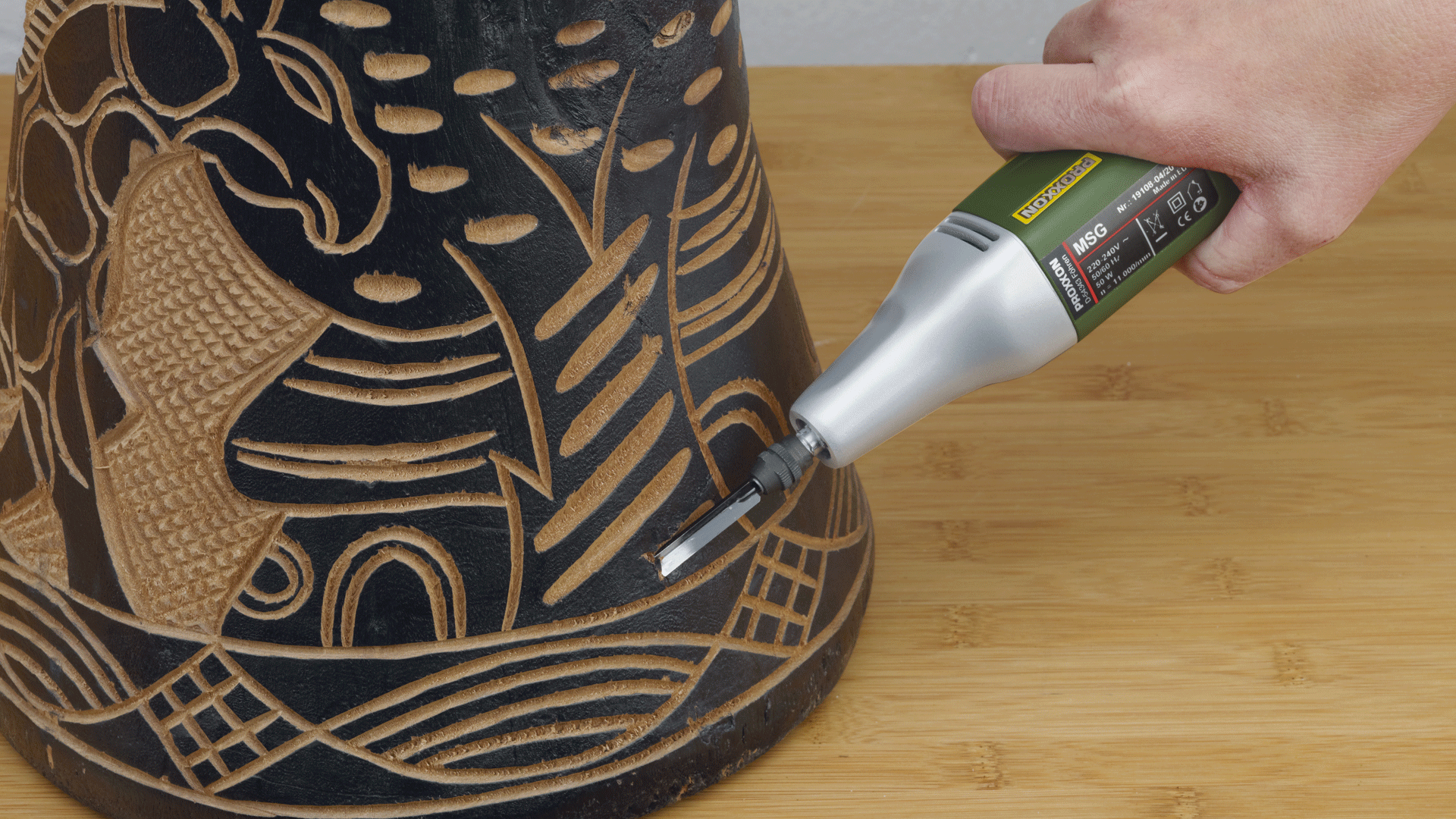 Het PROXXON Motor-Houtsnijapparaat MSG is een krachtig precisiegereedschap voor fijn snijwerk en gedetailleerde bewerkingen. Het apparaat is uitermate geschikt voor het snijden van alle houtsoorten, het renoveren van meubels, het opknappen van antiquiteiten en voor linoleumsneden. Ook verfresten kunnen zeer fijn worden verwijderd en zelfs gips laat zich gecontroleerd en zuiver bewerken.