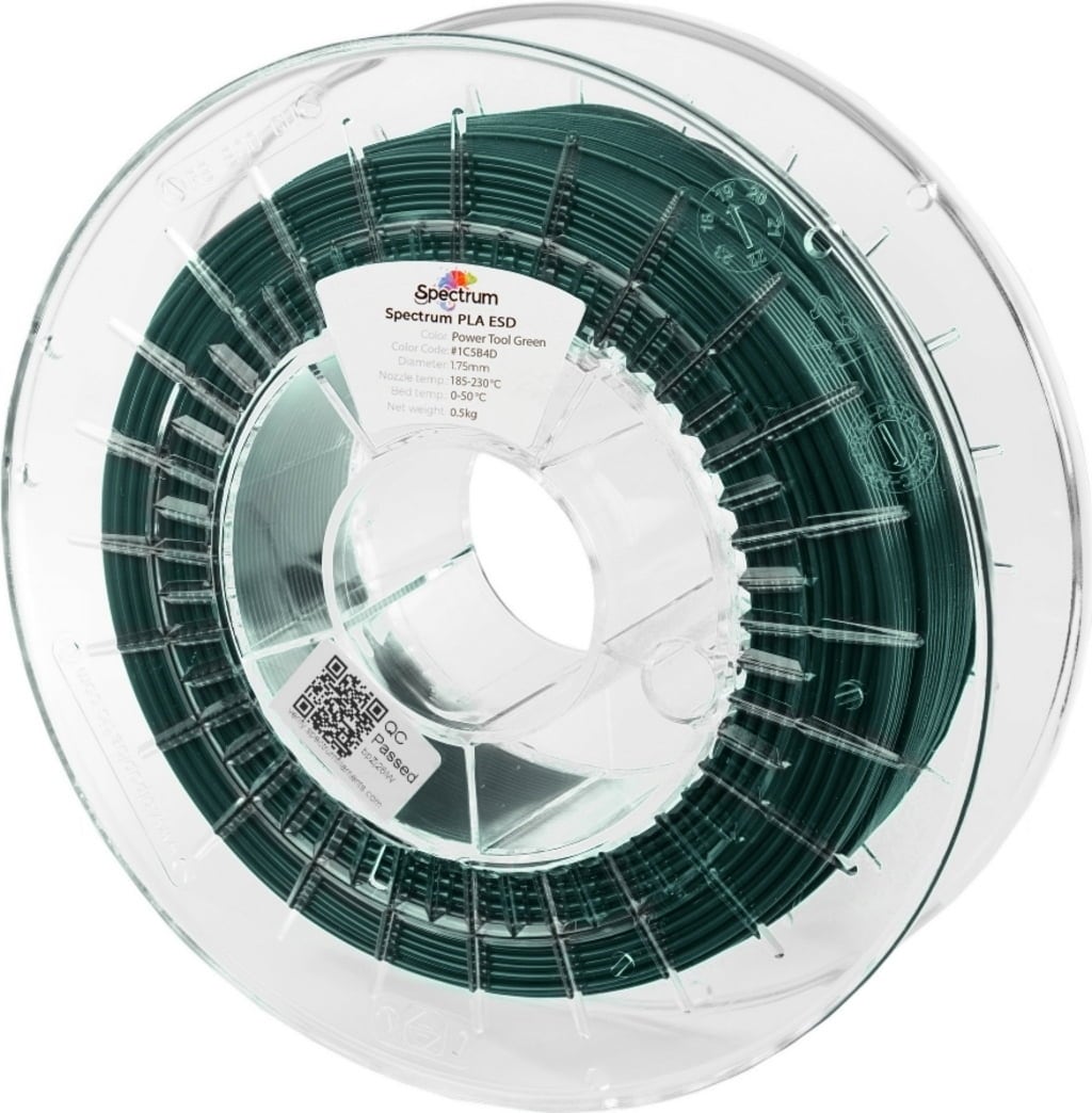 Spectrum PLA ESD is een gespecialiseerd, antistatisch PLA filament ontwikkeld voor toepassingen waar elektrostatische veiligheid, printprecisie en gebruiksvriendelijkheid de hoogste prioriteit hebben. Als gemodificeerd PLA biopolymeer combineert het de gemakkelijke verwerkbaarheid van klassieke PLA materialen met permanente ESD bescherming, waardoor het ideaal is voor gebruik in gevoelige elektronische omgevingen en in EX/ATEX-gebieden waar vonken koste wat het kost vermeden moeten worden.